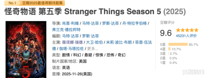 第五季第一卷上线后,口碑和数据都很稳:豆瓣9.6高分开局、播放量破纪录,至少可以确定一件事,《怪奇物语》没有烂尾,它选择认真讲完这个故事。